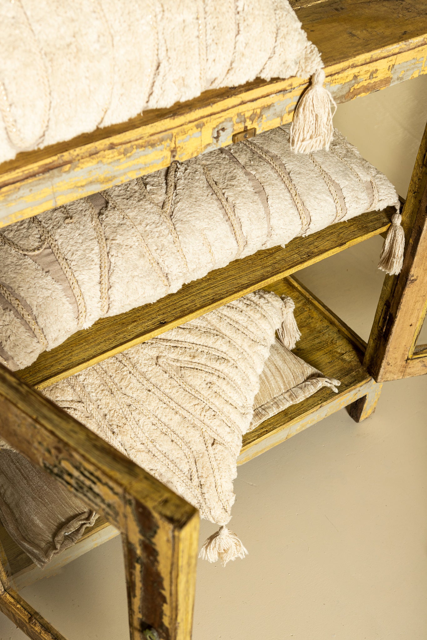 Zacht en elegant: dit rechthoekige kussen is gemaakt van beige fluweel en voorzien van een speelse, gerimpelde rand. Perfect voor een warme en verfijnde touch op je bank of stoel.