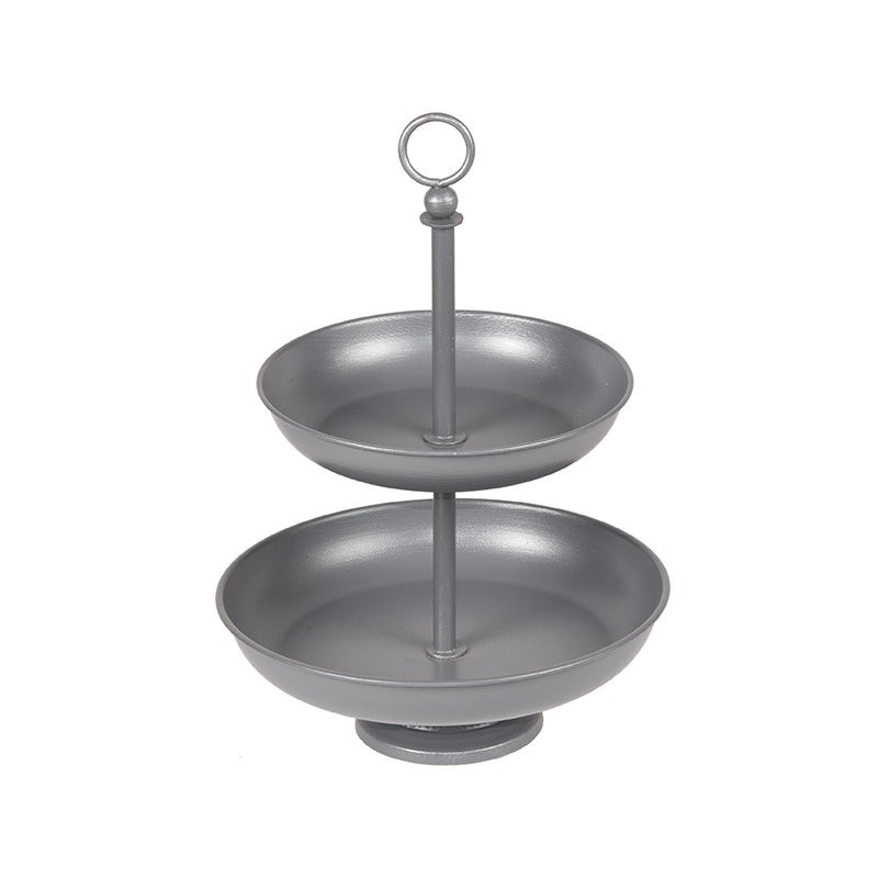 Deze etagère, gemaakt van hoogwaardig metaal is uitgevoerd in de kleur antiek grijs. De etagère is voorzien van twee royale plateaus om er nog meer op kwijt te kunnen. Erg leuk om er heerlijke versnaperingen op te leggen maar je kunt er ook mooie decoratie op presenteren.